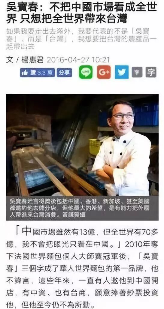有网友扒出在2016年,这家面包店的创始人吴宝春曾在台湾媒体上,公然发布过台-独言论。