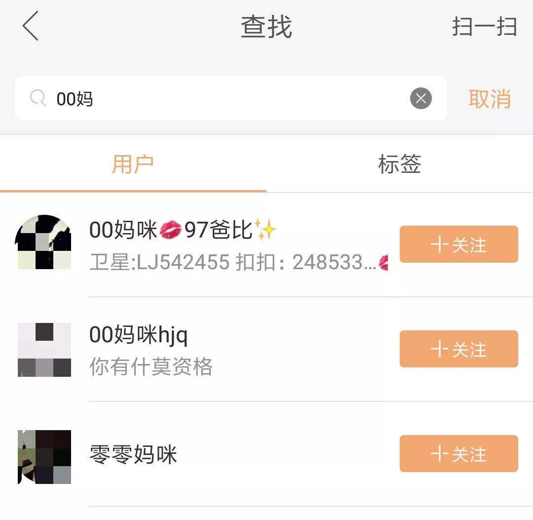 以关键词“00妈”搜索,仍有相关用户,比如,第一个名称的个人信息就是:“00妈咪,97爸比”。