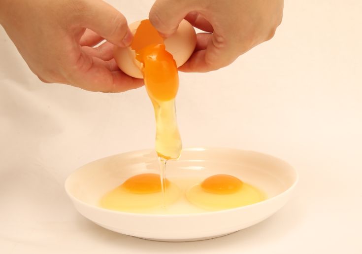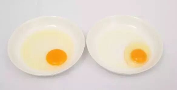 将鸡蛋打到盘中,蛋白摊开的面积小,蛋黄饱满鼓起的就是新鲜的好蛋。如果蛋黄蛋白都无精打采地铺成一滩,那么就说明挑鸡蛋挑失手了。蛋白摊开的面积小成固体状,说明鸡蛋新鲜,且蛋白质含量高,这和母鸡的运动量也有关。