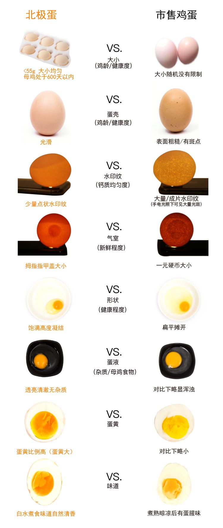 首先是蛋壳光滑度,蛋壳越光滑代表母鸡的健康程度越好,当母鸡年龄过大时由于钙质不均衡,蛋壳表面也就随之不均匀,出现水印纹(可用手机的手电筒对准鸡蛋,看到蛋壳表面的亮点即为光斑,也就是水印纹),一般市面买到的蛋表面比较粗糙,在手电筒照射下会出现大量点状光斑或成片的光斑,而北极蛋的表面光滑细腻,照射下仅有少量点状光斑,代表母鸡钙质充足鸡龄健康,有足够的运动量。