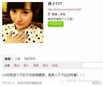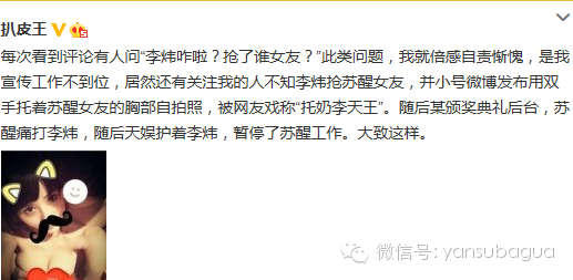 照片是李炜用马甲传的,之给自己的脸打了马赛克……女方发微博怒骂