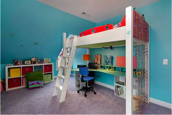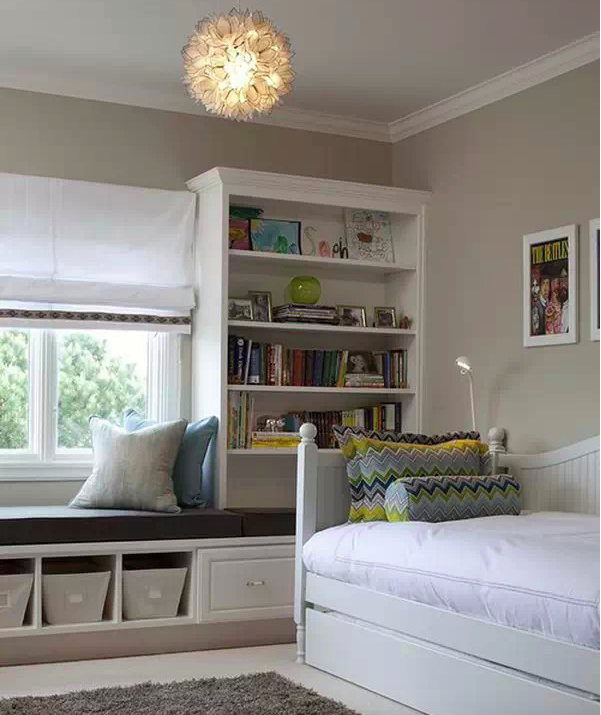 干净的颜色,储物柜和床相连,上架的孩子还可以把储物柜顶部当做书架。各有各的小空间,nice!