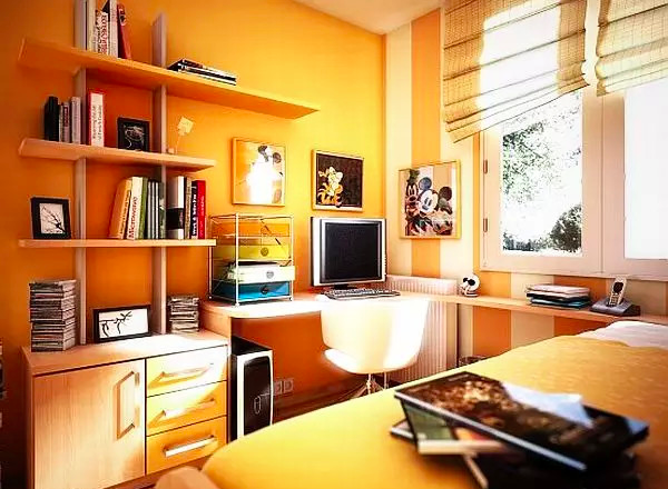 ▲空间比较饱满,有书桌、沙发和储物柜,还有红色花朵抱枕。