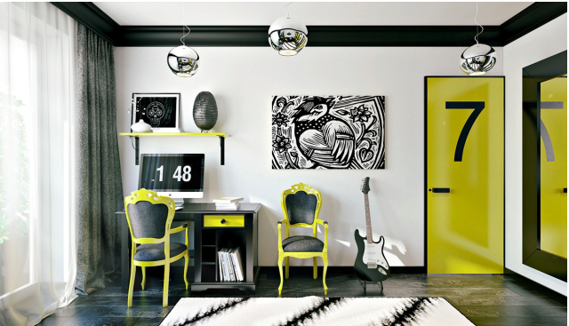 ▲黑色和黄色的对比运用非常大胆。学习区和沙发给有创意的青少年一个理想的创新地。