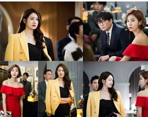 袄袄媛饰演的女一是集团代表,黑色开叉礼服加鹅黄色西装,既能吸睛秀美腿,又能突显女企业家的身份。女二——白兔,白兔红色一字肩礼服,贴身优雅,荷叶边恰到好处,即使手臂有点肉肉都不怕,大胆穿。