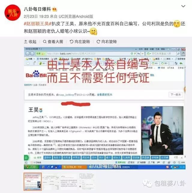 后来王昊被爆料其实是借着赵丽颖炒作,百度百科都是自己编的,公司利润是负的,甚至还是已婚,粉丝都炸了