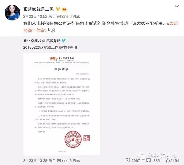 张越家这边还慢慢悠悠的在2月23日发表了一条赵丽颖未进行任何名义的资金募集的律师函,然后就不见任何动静了