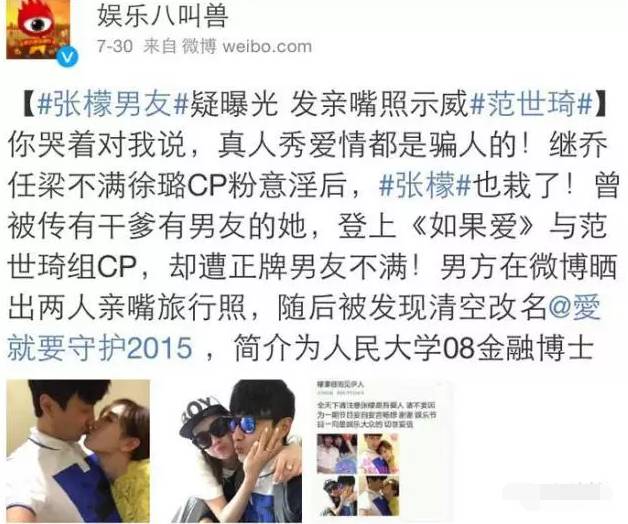 然而就在这综艺把两个人人气都往上推了一把的时候,张檬的“正牌男友”李濛竟然怒火攻心坐不住了,故意晒了几张和张檬的亲密合照,并称“全天下请注意张檬是吾爱人”,不顾自己女朋友事业,直接宣示了主权!