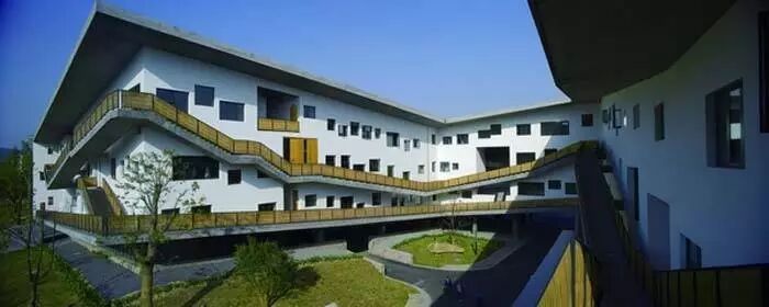 王澍把校区设计成一个类似农村的开放式建筑群,建筑本身的运动曲线与丘陵的起伏相呼应,在视觉上形成一条纽带。而回廊和走廊像蛇一样穿梭在建筑内外,加强了整个建筑的呼吸。