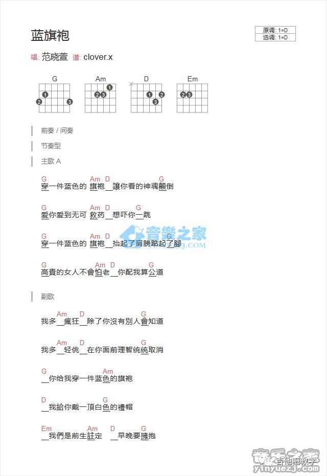 D调版 范晓萱《蓝旗袍》吉他和弦弹唱谱歌词