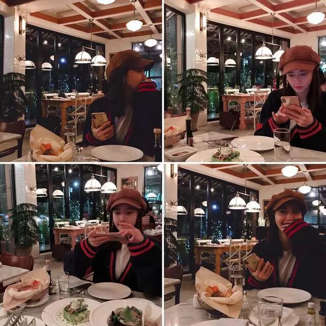 照片中,戴着贝雷帽的允儿坐在餐桌前对着眼前的美食拍照,四色不同的表情乖巧甜美又可爱~今天也是为可爱允心动的一天!