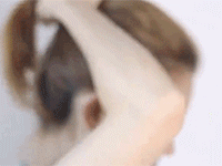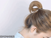 step2:为了让丸子更加稳固,小美建议使用两条橡皮筋。先用一根橡皮筋把头发扎成马尾,然后用环绕拧转的方式把马尾盘成丸子。