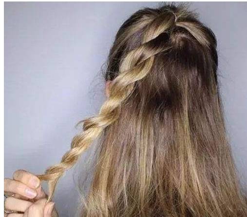 Step1:把刘海一式两份分在左右两侧,抓住一边的刘海快速转动,就像拧麻花一般。