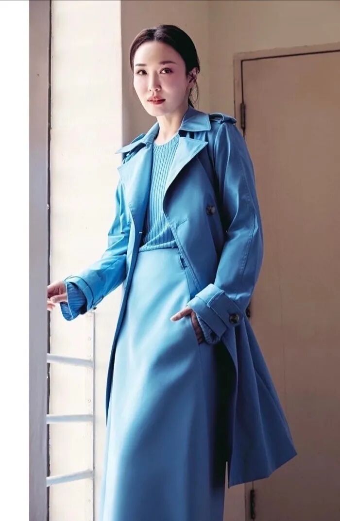 百搭的卡其色风衣不够个性,大家可以寻找一些色彩饱和度不高的风衣,比如雾霾蓝色,清冷又不失温柔气息,范文芳就选择了顺色搭配雾霾蓝风衣的方式,顺色搭配可以让搭配更有造型感,同色系搭配的精髓就在于配色相同却层次分明,这一点我们可以应用不同面料的单品组合来完成。