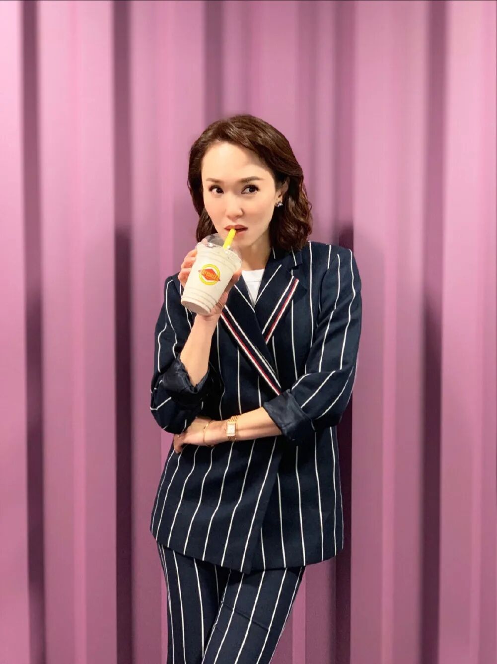 西服套装就是比较理想的初秋搭配,不同的面料材质以及不同的图案都会给人不一样的风格呈现,如果喜欢慵懒休闲一些,有垂坠感的条纹西服套装就很适合你。范文芳穿着的这套条纹西服套装虽然是深色系,却在领口有了撞色的点缀,显得更加休闲,初秋的天气日常通勤穿着就刚刚好。