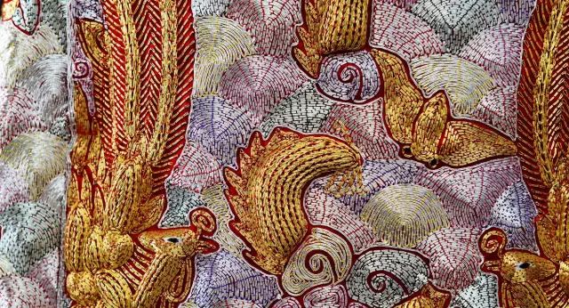 金银线密度越高,当然价格也越高。接近100%金银线密度的裙褂被称为“褂皇”,整件裙褂均由金银线覆盖表面,看上去金碧辉煌,炫彩夺目,是难得一见的珍品。
