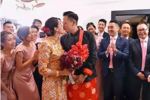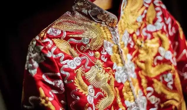 胡杏儿穿的是龙凤褂中的王中王褂皇。绣褂皇的师傅起码要有十五年的绣工经验,褂裙上是金银线全密的手工百分百三维立体刺绣,堪称极品中的极品。她身上的褂皇衣角为传统的平角样式,平与“齐”同义,寓意四平八稳,白发齐眉。