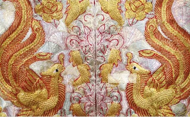 在旧时,这样高水平的裙褂需要一年时间制作。接下来按照金银线密度不同,分有“褂皇”“褂后”“大五福”“中五福”“小五福”等。