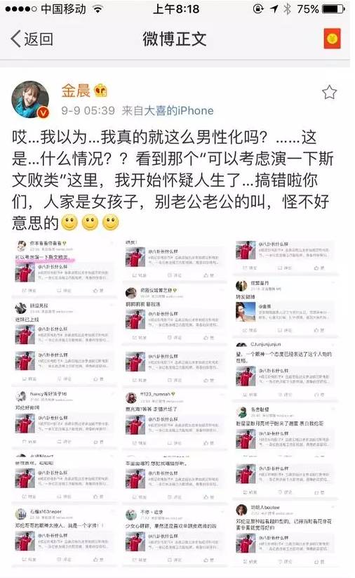 前几天,金晨发了一条微博,看起来是调侃自己很男性化,说粉丝别老公老公的叫她了,怪不好意思的。