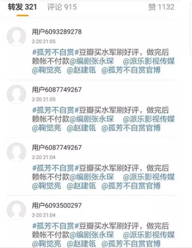 有网友还在《孤芳不自赏》的豆瓣评论区内,贴出了该剧播出期间刷帖水军的账号。