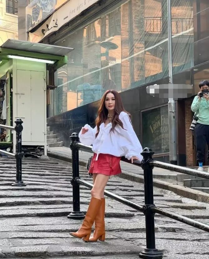 在香港街头凹造型,她选择了一件简约而优雅的白色衬衫,搭配上一条鲜艳的红色短裙,整体造型既清新又不失热情。衬衫的纯净白色与短裙的热烈红色形成了鲜明的对比,既展现了她的知性气质,又透露出几分俏皮与活力。而脚下那双棕色的高筒靴,更是为整个造型增添了一抹时尚的色彩。高筒靴的设计巧妙地拉长了她的腿部线条,显得双腿更加修长纤细。
