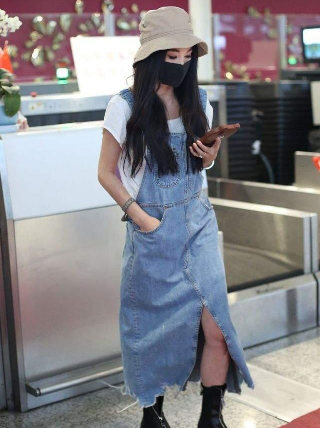 当她步出机场,又一次成为了镜头的焦点。一件基础款的白色T恤,配上牛仔背带裙与黑色短靴,整体形象既青春又充满活力。尽管岁月已在她的脸上留下了些许痕迹,皮肤不再紧致如初,但她的精神状态却依旧年轻而富有朝气。