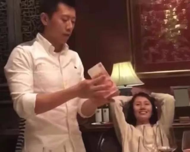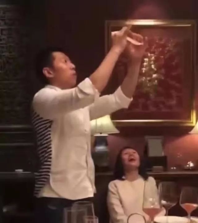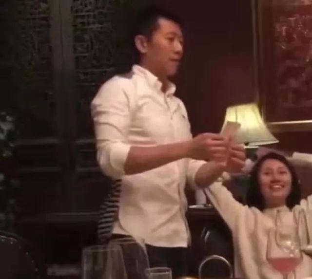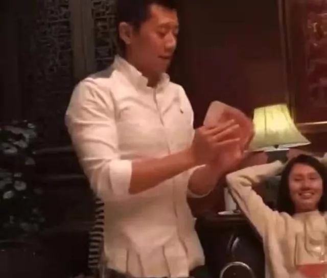 夏雨的手里面拿着一张一百元的纸币,一会高高拿起,向餐桌上面的朋友展示纸币。一会又将纸币拿在手里。但是夏雨变魔术的手势并不是非常熟练,所以有一些慢。