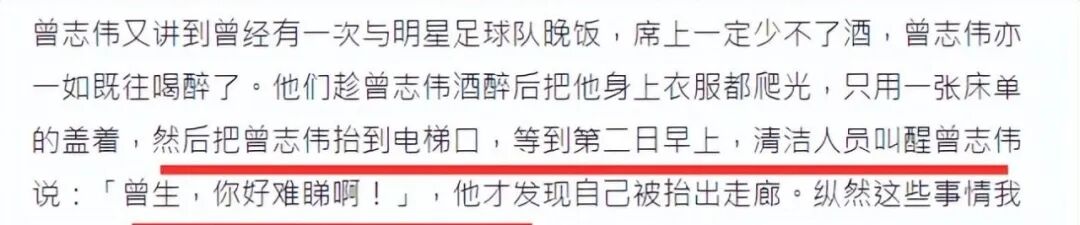 当时曾志伟和一众队友喝酒庆祝,作为逢场必醉的曾志伟来说,当然不能“放过”。不过队友却趁机把他身上的衣服扒光,只用一张床单盖着,然后将其放到电梯口,等待第二天早上,清洁人员前来打扫的时候才将其叫醒。
