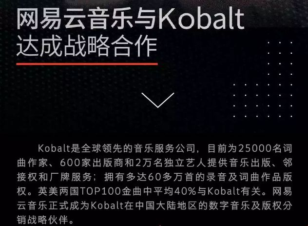 2017年12月4日,网易云音乐获得Kobalt Music多达60余万首的录音及词曲作品版权。
