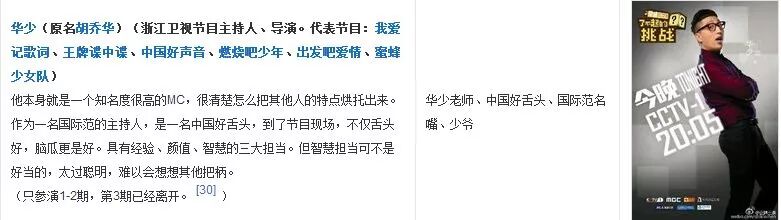 讲真,睁眼瞎也就是这样了吧?我看了那么多期感觉一直都是撒贝宁是MC吧?华少也只有出现那么几期而已,就是很明确的嘉宾(毕竟是央视爸爸的节目啊)