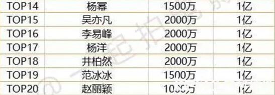咱们看一下目前最新的明星片酬top100的部分名单吧,顶级艺人像是成龙、刘德华这些人是不接电视剧的,紧接着就是流量鲜肉、花旦们破亿的高价。