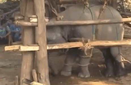 但如今,小象在很小的时候,就要被迫与母亲分离,被驯象师用铁链锁住关进一种木质的挤压笼,大象关在里面只能站立不能移动也不能卧倒。