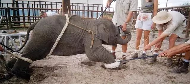 一名大象研究员说“最近50年,就采用这种残忍的大象训练手段。现在驯象师不爱大象,只把它们当做赚钱工具,为了要在最短的时间挣最多的钱,我见过很多象是活生生被折磨死的。”
