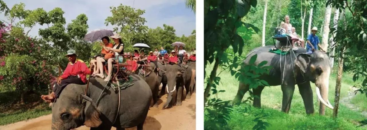 大多被人工驯养的大象都被用在旅游业,训练的过程极其残忍,大象的基因决定了它们并不适合被人骑行。虽然它们看起来很强壮,但脊柱是他们身体最脆弱的部分,一头成年大象背上最多可以承担150公斤的重量4个小时。