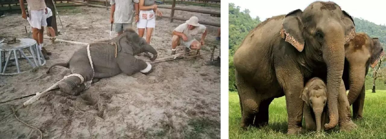 为了让天生不适合负重的大象顺从,驯象过程更是难以想象的残忍,泰国驯象师们采用的是一种名为“Pajaan”的驯象手法。