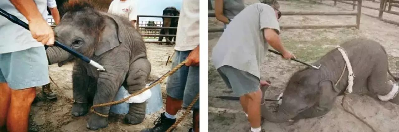 然后,每天清晨和傍晚都用象钩使劲抽打一个小时,如此持续半年,直到它们身体虚弱到无法站立,精神也濒临崩溃。