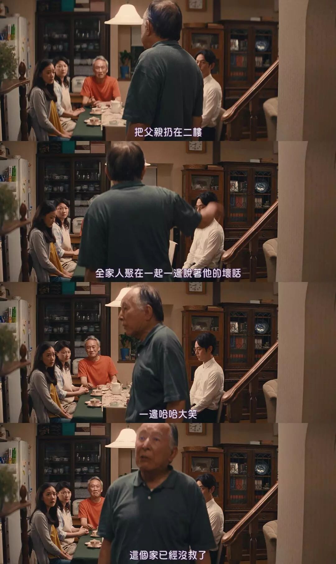我有时候觉得这个七十多岁的老人说出来的话可能就是导演想说的话。因为到那个年龄之后,可能对于生与死就看得比较淡了,每天都要有人走。周造想让自己的儿子或者女儿谁陪他去参加一下同学的葬礼。他觉得他应该去送送他。虽然很多年都没有什么联系了,但是他觉得有些事情是注定的,比如再遇见,比如死在了自己家里。或许有些仪式性的事情需要完成吧。小儿子和儿媳说本来也要去参加葬礼的,因为儿媳觉得死去的老爷子挺可怜。