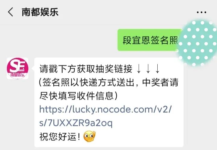 星姐来送福利啦!点击本文“阅读原文”或者在本公众号回复“段宜恩签名照”,在小程序里参与抽奖,就有可能获得星姐送出的段宜恩亲笔签名照,一共有4张哦~