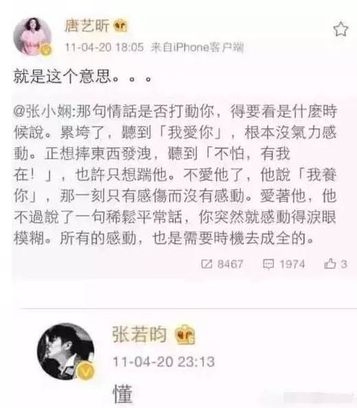 张若昀和唐艺昕还时常在微博互动,低调地秀着恩爱,一个简洁的懂字就胜过千万句甜言蜜语,一个简单的点赞就足以表达我对你的情意。