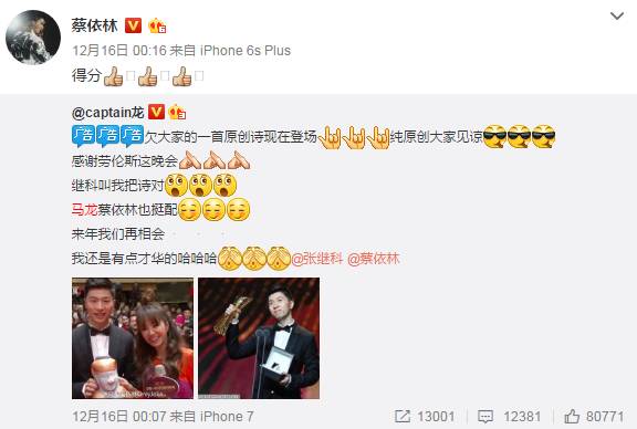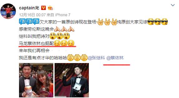 日前蔡依林和马龙共同出席活动,马龙不但大方表达自己对偶像的喜爱之情,还写了一首打油诗表示——“我俩很配”。
