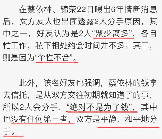 分手的原因更多的是“聚少离多”和“个性不合”,并表示“绝对没有第三者”。