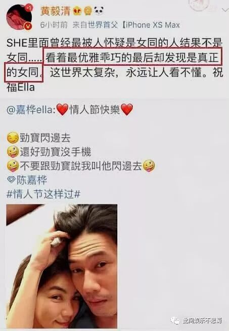 在2月15日凌晨,黄毅清转发了曾经的she组合中Ella的微博,并配文称曾经被人怀疑最像女同的人却已经结婚生子,而看似最优雅乖巧的人却成了真正的女同,这世界太复杂,让人看不懂。对于黄毅清的这番言论,很多网友便想到了他所指的这位女同就是田馥甄。