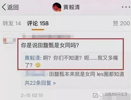 因为近年来田馥甄一直处于单身的状态,因此呢对于田馥甄出柜一直以来都被大家认为是公开的秘密,不过这从未得到过田馥甄本人的回应,因此呢,事实到底是怎样的我们大家也不得而知。而网友们听闻了黄毅清的这一番言论则发出了疑问:你说的难道是田馥甄吗?对此,黄毅清也秒回了网友称:大家难道不知道吗,难道我又多嘴了?