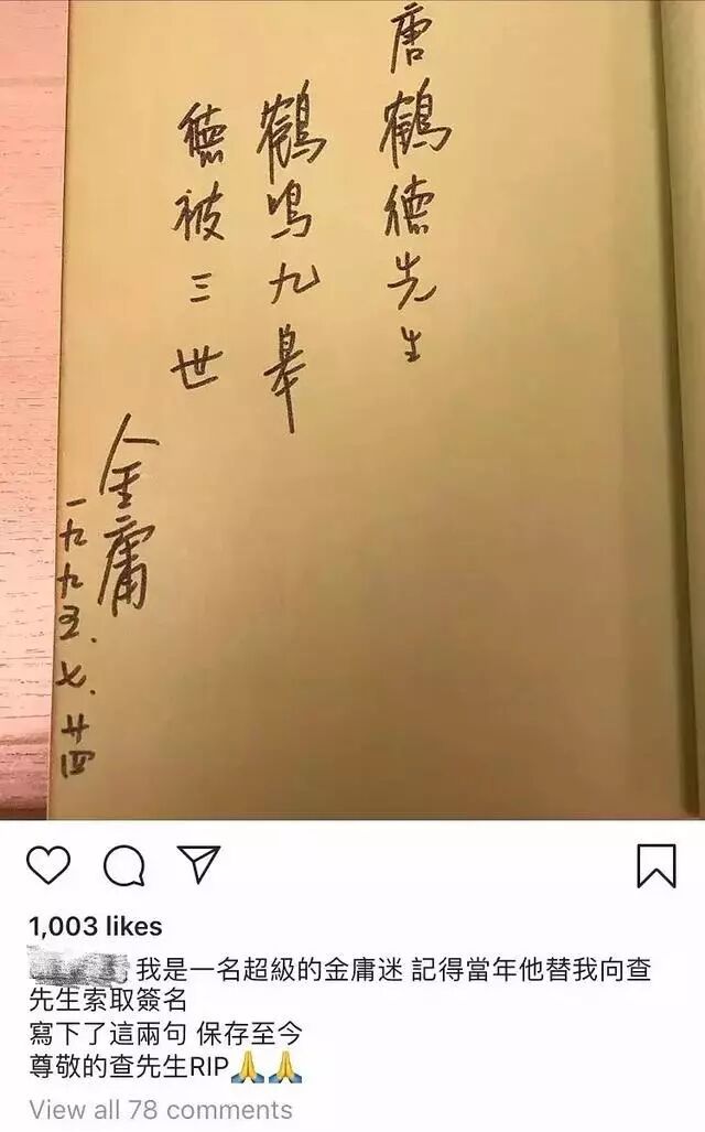前段时间金庸去世的时候,唐鹤德在社交平台还晒出了金庸曾给他的签名,他说这是当年“他”替我向查先生(金庸原名)索取的签名。
