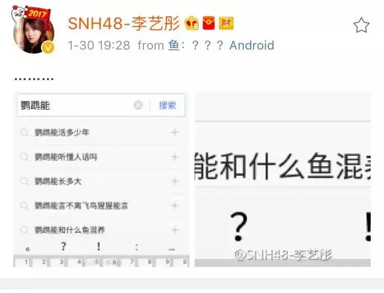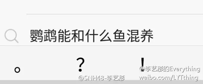 搜索“鹦鹉能”关键字,关键字联想中赫然出现“鹦鹉能和什么鱼混养”,这令李艺彤十分不解,并导致原博评论区大量装鱼人类出没,沦为大型碰瓷现场,这里不便放出。