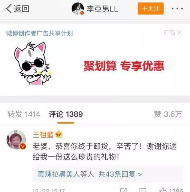 王祖蓝也是很可爱,在老婆的微博下评论,恭喜终于卸货,辛苦了!谢谢老婆送给他这份珍贵的礼物。