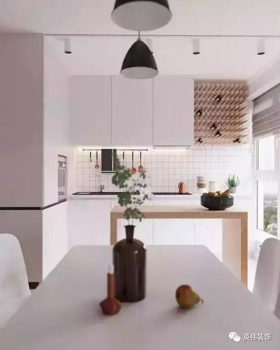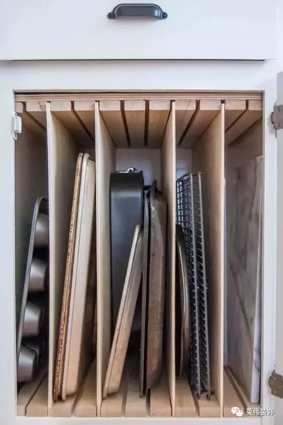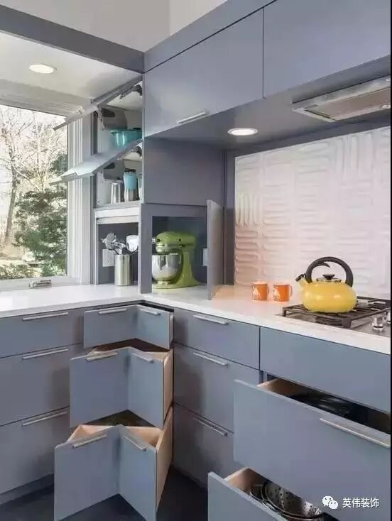 如果你的餐厨具形状和色彩非常多样,难于整理,就直接把它们隐藏起来,尽量达到“台面无物”的视觉效果。