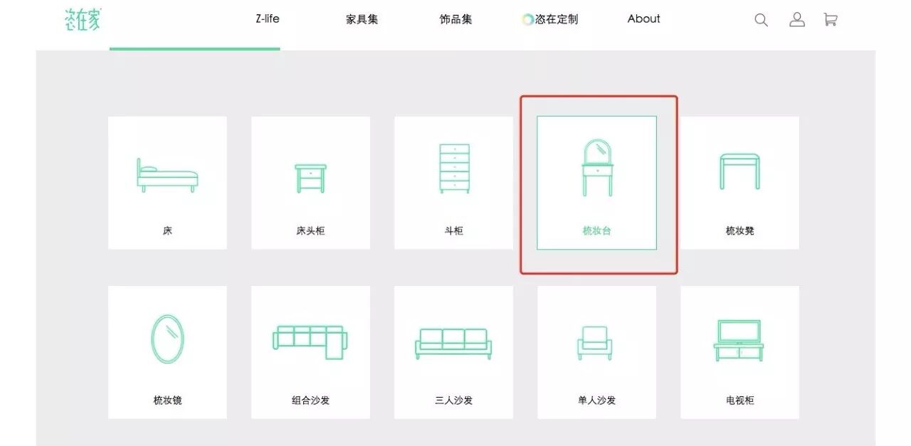 将这一切交给恣在家Zest Home吧。我也试图在这里找到属于自己的家居文化,我试着打造一台自己脑海里的梳妆台。打开恣在家Zest Home官方网站,点击恣在定制,下面有不同的软装产品可供选择,我选了梳妆台。