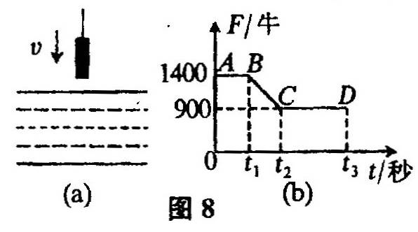 30.在图a中,石料在钢绳拉力的作用下从水面上方以恒定速度下降,直至全部没入水中.图8(b)是钢绳拉力F随时间 t变化的图像.若不计水的摩擦阻力,则可算出该石料的密度为( )