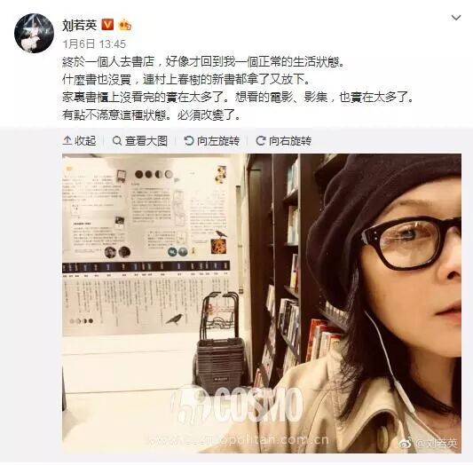 如果你为此愁白了头,翻翻刘若英的微博没准可以收割一些灵感。虽然拍戏拍不停,可奶茶一有空就会跑到书店里躲清静。这不,前几天还偷偷扎进了诚品书店,虽然零收获,可奶茶却抽空反思了一下自己只买不看的缺点。